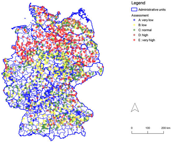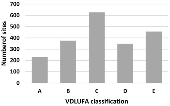 According to the classification scheme of the VDLUFA balance method, soils at levels A and B are expected to have potential for higher productivity under improved humus management. For soils at levels D and E, the applied organic amendments could be checked for alternative use, and soils at level E are especially suspicious for environmental problems caused by high carbon and nitrogen mineralization rates. This indicates, despite most sites being at level C (normal), that there is some room for improvements and a critical inspection of the current management, especially for the more than 450 sampling points at SOM level E (high), which are mainly located in the northern part of Germany (Figure 5). Soils at levels A and B that appear mainly in the southwestern region are good candidates for improved management to increase SOC stocks and thus contribute to climate change mitigation.