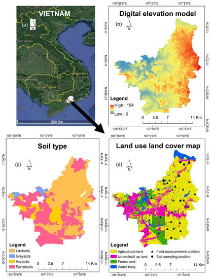 Location of the study area in Vietnam (a) and the related information. The digital elevation model (DEM, b) was obtained from the United States Geological Survey—USGS (https://earthexplorer.usgs.gov/ (accessed on 24 March 2020)). Soil map was obtained from the Department of Agriculture and Rural Development of Dong Nai Province (c). Land use land cover map (d) was interpreted from the satellite image Sentinel-2 MSI (https://scihub.copernicus.eu/) on 27 February 2020. The triangular points are the soil pH and moisture measuring positions, the circular points are the soil sampling positions.