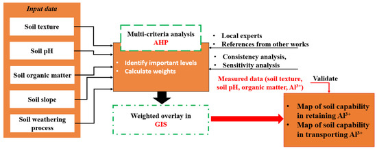 The GIS-based AHP method was applied to calculate the weights and importance levels of soil capabilities in adsorbing and transporting Al3+. The following steps were carried out: (i) Defining the objective, (ii) Identifying factors and constraints using different information sources (expert opinion, literature search, and analysis of field data), (iii) Defining the relationships of the soil properties and their capability for retaining and transporting Al3+, (iv) Weighting the criteria based on their relative importance to each soil capability (retention or transport), (v) Combining and aggregating all the layers/criteria to produce a final weighted estimate of soil capabilities, and (vi) Conducting sensitivity analyses and validating the results.