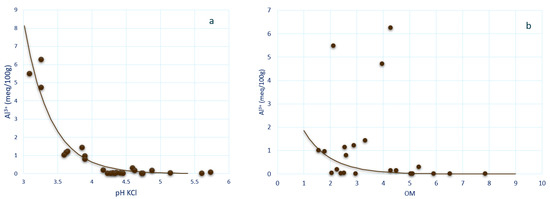 (a) Relationships of Al3+ concentrations and soil pH and (b) Relationships of Al3+ concentrations and soil organic matter in the study area. Al3+ concentration decreases following the gradient of soil pH and soil OM. The points are data, the values of which are shown in Table 1.