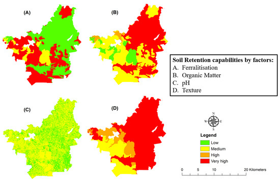 - For soil retention capability, the factors soil pH and soil texture are more sensitive than the factors of soil weathering and organic matter (cf. Table 4 and Figure 4). Soil pH and soil texture cause significant capability classes modification from the base map (which used weight values from Table 3); the number of cells changed (cell size 100 m2) from the base map are 650,708, 195,402, 846,259, and 149 for S1, S2, S3, and S4 when their weights decreased or increased outside the range (−18%, +23%) for pH factor, and the differences amount to 673,378, 443,563, 814,192, and 302,723 cells when their weights decreased or increased outside the range (−16%, +23%) for the factor soil texture.