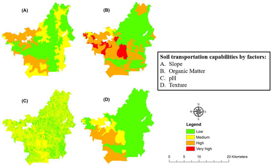 - For the soil capability in transporting Al3+, the soil texture and slope are the most sensitive factors; the weight of the factor soil texture causes significant changes to the soil transportation levels (the number of changed cells reached up to 733,149, 567,986, 166,706, and 116) compared to the base map, when its weight decreased or increased outside the range (−2%, +16%) from the base weight value. For the soil slope, the changed cells reached up to 733,037, 568,009, 166,582, and 116 when its weight decreased or increased outside the range (−10%, +21%) from the base weight value. The factors pH and organic matter in turn also made changes to the soil transportation levels when their weights fell outside the ranges (−25%, +4%) for pH and (−17%, +25%) for organic matter, but the cell differences were not so large (cf. Figure 5).