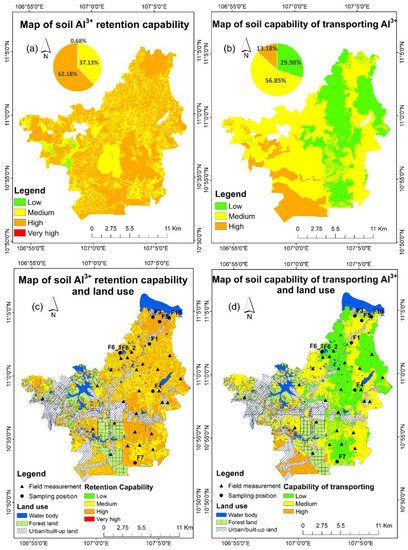 where S is the soil capability class. Wi and Xi are the weights and importance levels of factor i, and n is the total number of factors. Soil capabilities range from 1 to 4, level 1 (S1, S < 1.5) shows no capability for Al3+ retention or transportation in the soil, level 2 (S2, S (1.5, 2.5)) shows medium capability, level 3 (S3, S (2.5, 3.5)) shows high capability, and level 4 (S4, S > 3.5) shows a strong capability. Local experts’ opinions (n = 53) and the related referenced works as well as sampling data were used as the basis to determine the factors and their ranks of capabilities.