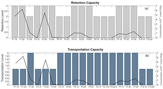 Concentration of Al3+ (curves) against soil levels (bars) of retention (a) and transportation (b). The positions of the samples are shown in Figure 8c,d.