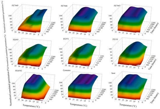Temperature and time course response–surfaces of the normalized cumulative germination percentage of nine accessions of F. arundinacea.