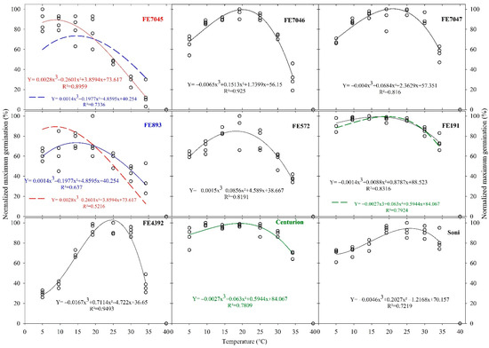 Only two wild accessions, FE7045 and FE893, have reciprocally exchangeable, statistically valid (p < 0.05), adjusting curves. From this, we conclude that they are not different in their response to temperature for seed germination. Further, the second observed similarity concerns wild population FE191 and cultivar Centurion. The caveat here is that the polynomial that best fits Centurion also fits (p < 0.05) the data of FE191, but the reciprocal was not true.