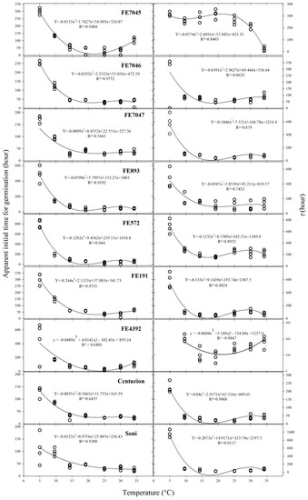 The seed germination response to temperature can be used as an early marker for the selection of genotypes adapted to future climatic conditions. Recently, it has been shown that germination responses to temperature vary depending on the origin of accessions and can be an indicator of the degree of domestication in Medicago sativa L. [5,25]. The objective of this work was twofold: (i) analyze the intraspecific variability of tall fescue in response to a constant temperature during germination and (ii) quantitatively describe the response curves