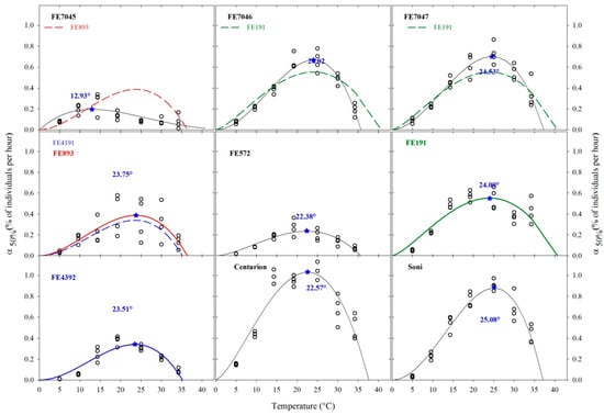 For curve-fitting purposes, the low boundary was fixed to 0 °C. The upper limit appeared between 35 and 40 °C. The goodness of fit was different between populations. Population FE7045 was fitted the Beta model in the form of Equation (1), because its optimum was found in the first half (12.9 °C) of the experimental temperature range. The other eight accessions, that peaked between 22 and 25.1 °C, were fitted the Beta model in the form of Equation (2). The sequential analysis of pairwise comparisons did not detect reciprocally exchangeable, statistically valid (p < 0.05) adjusting curves.