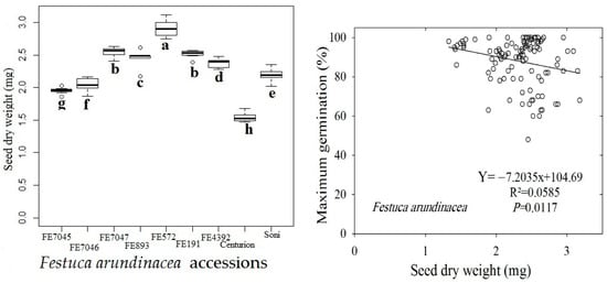 Box plots of seed dry weight (SDW) of the nine studied accessions of F. arundinacea (Left) and regression plot of the maximum germination percentage against SDW (Right). Same letter under the boxes indicates that means are not different after a Tukey’s HSD test (p < 0.05).