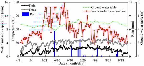 The field experiment was conducted in a typical salt-alkali cotton field located in Korla city, Xinjiang (40°53′03″ N, 86°56′58″ E, 900 m above sea level), China (Figure 1). The region enjoys a typical continental desert climate. The annual mean precipitation is 135.4 mm, whereas the average annual potential evaporation is as high as 2417 mm. The daily water surface evaporation, buried depth of groundwater, maximum temperature, minimum temperature and daily precipitation data during the cotton growth period are shown in Figure 2. The total rainfall during the cotton growth period was 18.6 mm, while the effective rainfall was only 5.6 mm. The water surface evaporation increased first and then decreased during the cotton growth stage and was particularly high during May to June; moreover, the average buried depth of the groundwater was 1.53 m.