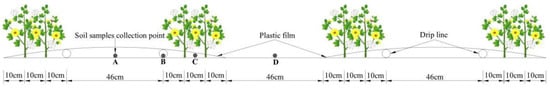 Soil samples for moisture determination were collected (at position B in Figure 3) every day with a soil auger (5 cm in diameter and 25 cm high) during the growth period of cotton at depths of 0~20, 20~40 and 40~60 cm. Soil samples for the calculation of water consumption in different growth stages and soil salt content measurements were taken at the end of each cotton growth stage (budding, flowering, boll forming and boll opening stage), one day before sowing and harvest as well; the sample collection depths were distributed as follows: 0~10, 10~20, 20~40, 40~60, 60~80 and 80~100 cm, and the samples locations are shown in Figure 3 (A, B, C, D).