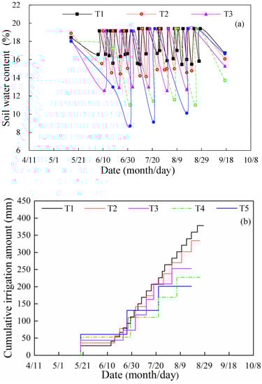 The variation in soil water content in the designed wetting layer during the growth period of cotton is shown in Figure 4a. The soil moisture for each treatment at seedling stage (15 May) was 18%, which was close to the FC, while the soil moisture after cotton harvest (17 September) was significantly decreased compared with that in the seedling stage. Due to the higher soil water lower limit in T1 treatment, the irrigation quota for T1 treatment was small, and the irrigation frequency was higher than in other treatments; moreover, the soil moisture for T1 treatment usually decreased from 100% FC to 85% FC within 3~4 days. Contrarily, as the soil water lower limit for T5 treatment was low, the soil moisture after each irrigation was higher than the designed soil water lower limit for a long time, which resulted in a low irrigation frequency with an interval of about 26 days. As shown in Figure 4b, the irrigation frequency and cumulative irrigation quota for treatments both followed T1 > T2 > T3 > T4 > T5, the cumulative irrigation quota for T1 treatment reached as high as 378 mm, and the cumulative irrigation quotas for the T2, T3, T4 and T5 treatments decreased by 9.52%, 30.65%, 38.99% and 44.94%, respectively, compared with that for the T1 treatment.