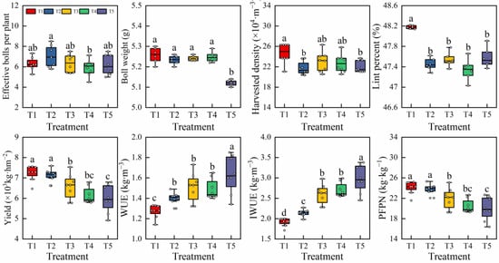 Generally, the cotton yield can be comprehensively affected by boll number per plant, harvest density, average boll weight, and lint percentage. As shown in Figure 5, there was a significant difference in yield components for treatments. T2 treatment obtained the highest boll number per plant, which was 10.44%, 9.85%, 15.80% and 11.65% higher than the boll number per plant obtained with the T1, T3, T4 and T5 treatments, respectively. The average boll weight of cotton with the T5 treatment was significantly lower than that with the other treatments (p < 0.05), while there were no significant differences for the T1, T2, T3 and T4 treatments (p > 0.05). Moreover, the T1 treatment obtained the highest value for harvest density, and the T3 treatment followed, while there were no significant differences among the T2, T4 and T5 treatments (p > 0.05). The lint percentage of cotton with the T1 treatment was significantly higher than that with the other treatments, which indicates that the increase in the soil water lower limit was conducive to an increase in the lint percentage of cotton. There was no significant difference in cotton yield between the T1 and T2 treatments; however, cotton production with the T3, T4 and T5 treatments was significantly lower than that with the T1 and T2 treatments. Additionally, with the decrease in the soil water lower limit, both the WUE and IWUE increased gradually, while the PFPN decreased. WUE and IWUE for the T2 treatment were significantly higher than those for the T1 treatment; however, there was no significant difference in PFPN between the T1 and T2 treatments.