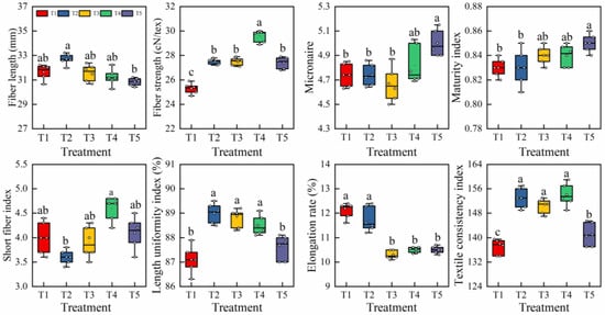 The cotton fiber quality for treatments. Different letters above the boxes indicate a significant difference at p < 0.05 according to the Duncan test.