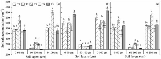 Soil salt accumulation for treatments in the boll opening stage of cotton. (a) Soil salt accumulation in the film; (b) Soil salt accumulation outside the film; (c) The total soil salt accumulation. Bars are the means + one standard error of the mean (n = 3). Different letters above the error bars indicate a significant difference at p < 0.05 according to the Duncan test.
