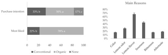 Consumer’s preference, purchase intention and the main reasons behind their selection of organic and conventional lemons. Factors with different letters were significantly different (p < 0.05), Tukey’s least significant difference test.