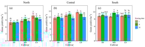 Grain yields of different cultivars and sowing dates in the Northeast China Plain: (a) North, Keshan station; (b) Central, Gongzhuling station; (c) South, Shenyang station. SS: short-season cultivars; MS: medium-season cultivars; LS: long-season cultivars; I: early sowing date; II: medium sowing date (traditional sowing date); III: late sowing date. Different letters above the error bars are significantly different at the 0.05 probability level. Bars represent the standard errors.