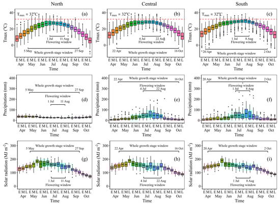 Distribution of maximum temperature (Tmax), precipitation and solar radiation in April–October (1980–2019) for the NEC: North, Keshan station (a,d,g); Central, Gongzhuling station (b,e,h); South, Shenyang station (c,f,i). E: the first ten days of a month; M: the middle ten days of a month; L: the last ten days of a month.