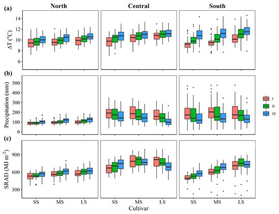 The diurnal thermal range (∆T, (a)); precipitation (b), and solar radiation (SRAD, (c)) of grain-filling stage at different maize cultivars and sowing dates from 1980 to 2019. North: Keshan station; Central: Gongzhuling station; South: Shenyang station; SS: short-season cultivars; MS: medium-season cultivars; LS: long-season cultivars; I: early sowing date; II: medium sowing date (traditional sowing date); III: late sowing date.