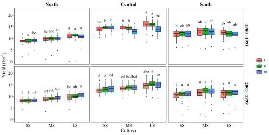 Simulated grain yield based on APSIM for different sowing dates and cultivars. The red dots represent the average yield, the black line shows the median yield. North: Keshan station; Central: Gongzhuling station; South: Shenyang station; SS: short-season cultivars; MS: medium-season cultivars; LS: long-season cultivars; I: early sowing date; II: medium sowing date (traditional sowing date); III: late sowing date. Different letters above the boxes are significantly different at the 0.05 probability level.