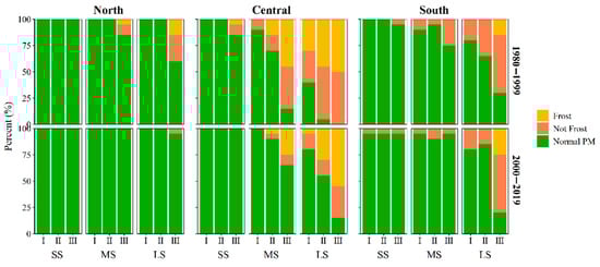 Risk of not becoming physiologically mature for spring maize. North: Keshan station; Central: Gongzhuling station; South: Shenyang station; SS: short-season cultivars; MS: medium-season cultivars; LS: long-season cultivars; I: early sowing date; II: medium sowing date (traditional sowing date); III: late sowing date; Frost: frost before harvest; Not Frost: harvest caused by early senescence; Normal PM: normal physiological maturity.
