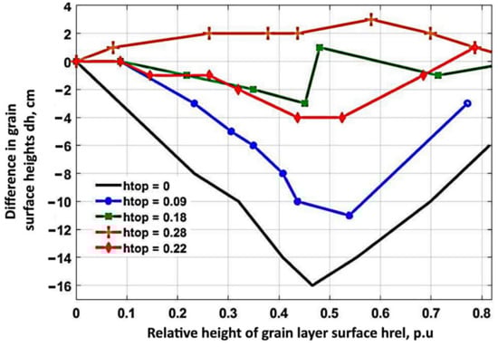 The results of the experimental research (Figure 7) revealed a significant effect of the vertical partition on the uniformity of grain movement in an outlet hopper. The graphs demonstrate that the highest uniformity was obtained for the variants , and . The unevenness is oscillatory at and . In the first half of the hopper height, the height difference is equal to zero or even negative. A negative value of indicates that grain movement in the right half of the hopper is faster than in the left. In the second vertical half of the hopper, the difference in grain surfaces heights becomes positive, then negative again and finally tends to 0. At , the differences in grain surface heights are always positive, but not more than 4 cm. We focused only on the data for , and so as to more precisely define the distances to the upper edge of the hopper, which ensures the minimum uneven grain movement along the hopper’s height.