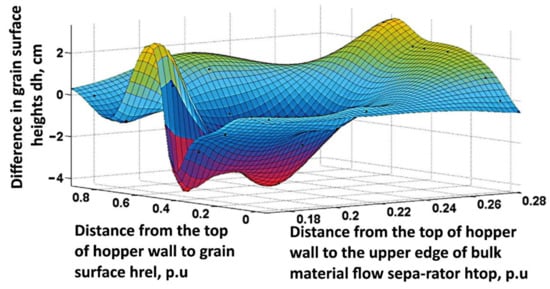 Contour surface analysis revealed that the smallest difference in the grain layer surface heights in the vertical halves of the outlet hopper is possible in the range of changes in the distance from the top of the hopper wall to the upper side of the bulk material separator 0.247… 0.256 p.u. This zone is marked as a rectangle abdc in Figure 9.