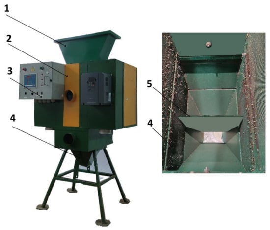 - Giyevskiy, A.M.; Orobinsky, V.I.; Tarasenko, A.P.; Chernyshov, A.; Kurilov, D.O. Substantiation of basic scheme of grain cleaning machine for preparation of agricultural crops seeds. IOP Conf. Ser. Mater. Sci. Eng. 2018, 327, 042035. [Google Scholar] [CrossRef]