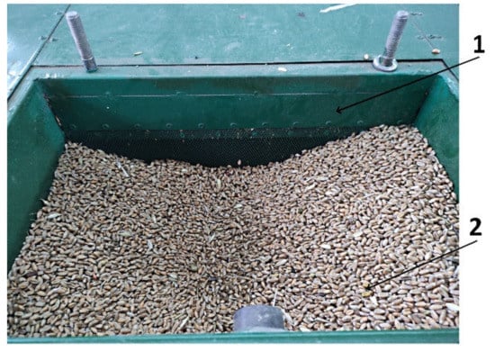 The experimental model was a part (section) of the outlet hopper 5 cm thick. The parameters of the model were calculated in accordance with the parameters of technological plants for microwave–convective grain processing (length and width). The productivity of the plant for microwave–convective drying of spiked crops was 15 t/h. The inclination angle of bunker walls was calculated based on the fact that the plant would process the grain of wheat, barley and sunflower [12]. For these crops, the following were taken into account: