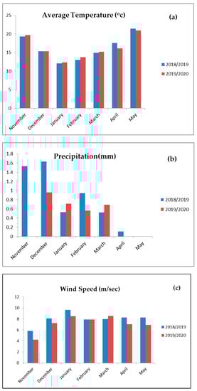 (a). Average monthly temperature (°C), (b). total monthly precipitation (mm) and (c). average monthly wind speed (m/sec) for the two winter seasons.