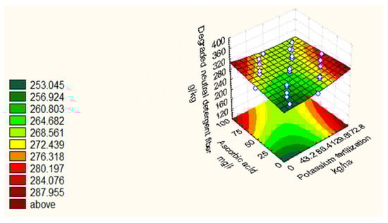 The regression equations (Table 4) indicated that the DNDF was significantly and positively affected by the linear components of PF, AA, and HA in 2019/20 with r2 = 0.93 and 0.89 for DOM, 0.89 and 0.80 for DNDF in 2018/19 and 2019/20, respectively. The optimal level of the quadratic effect of PF was 110.00 kg ha−1 for DNDF and that of HA was 6.04 kg ha−1 for DNDF, while, that of AA was 60.70 mg L−1 for DOM in 2019/20. Both DOM and DNDF were significantly and negatively influenced by the linear effect of AC in 2018/19 and 2019/20, respectively. The optimal level of the quadratic effect of AC was 76 DAS for DOM in 2018/19 and 77 DAS for DNDF in 2019/20. Nonetheless, DNDF was negatively affected by the linear interactions of PF*AA, PF*AC, and AC*HA in 2019/20 and of AA*HA in 2018/19. The highest DOM and DNDF (Table 7) values reached 662.5 g kg−1, 377.50 g kg−1 as an average of both seasons, and they were detected at the earliest levels of AC at 40 DAS (S5), Meanwhile, the lowest values for both characteristics were associated with delayed AC till 140 DAS (S6). The PF*AC (Figure 2), AC*HA (Figure 4) and PF*AA (Figure 6), interactions were significant and of negative relationship in 2019/20. The response surface revealed that the DNDF increased with increasing PF or AA in 2019/20. The response surface (Figure 2) showed that DNDF increased with cutting at early age and the highest level of PF in 2019/20. The response surface (Figure 4) showed that DNDF was significantly and negatively related with the AC*HA linear interaction, and the figure indicated an increase in DNDF with cutting at early age and high levels of HA. In addition, the AA*HA interaction was negative and significant in 2018/19, and the response surface (Figure 5) revealed that DNDF was highest at the highest levels of AA or HA.