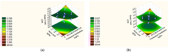 Response surface for grain yield as affected by PF and HA at the central levels of AA, and AC in (a) 2018/19 and (b) 2019/20.