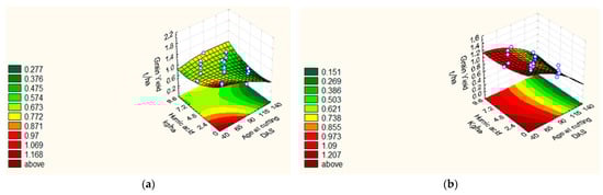 Response surface for grain yield in two seasons (a) in 2018/19 and (b) 2019/20, as affected by AA and HA at the central levels AA and HA.