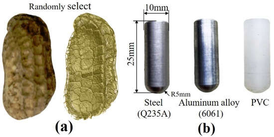 Figure 2 depicts peanut and pin specimens. The peanut specimen is “Dabaisha”, which is a typical peanut variety from the main peanut-producing areas in China. The specimens were collected randomly during peanut maturation. The parameters of moisture content, surface morphology, and weight were calibrated after collecting the specimens.