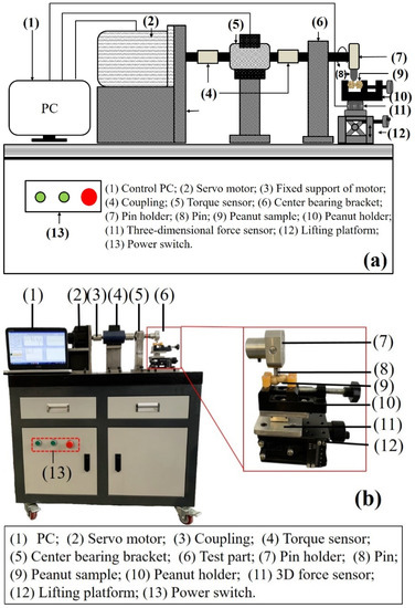 In this study, a peanut-picking impact-friction tester was designed to examine the peanut-picking mechanism of peanut harvesting under different conditions. Figure 3 shows a schematic and photograph of the tester. The main working parts are the control computer, 1000 W Servo motor (DELTA, ECM-B3M-E21310RS1, Taipei, Taiwan), motor drive (ASD-B3-1021-L, Taipei, Taiwan, dynamic torque sensor (MRN-01) (range: 0 ± 20 Nm; accuracy: <±0.5%), support bearing seat, picking rotary disk, picking spring teeth, peanut specimens, peanut fixed platform, 3D force sensor (SZOBTE, China (CL-TR5S) X: 5/200 N, Y: 5/200 N, Z: 5/200 N), lifting platform, and other parts. The driving shaft was driven by a servomotor to achieve positive and negative rotations and stable speed output under fixed torque to ensure the accuracy of test conditions. The driving shaft transmits power to the rotary disk through the torque sensor, and the connecting part is connected by coupling. The rotary disk was held in place by a bearing support to avoid vibrations or eccentricity due to the impact force in the test process. The peanut specimen was fixed on the platform, and its height could be adjusted by lifting. The power output by the motor drives the pin to rotate and contact with the fixed peanut to produce impact-friction. The fixing claw was coated with silica gel (thickness: 2 mm) to keep the surface of peanut intact when the peanut specimen was being fixed. The dynamic torque sensor was connected to the driving shaft to measure the spindle torque (T). A 3D force sensor was mounted under the specimen holder to measure the variation in triaxial force (Fx, Fy, Fz). The control and parameter settings of the experiment were realized using Labview programming. Dynamic curves of coefficients of friction and period changes can be identified in the display. The coefficient of friction (μ) was calculated using the measured force, as follows: