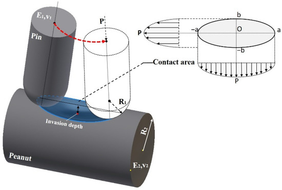where a and b denote the long and short axes of the ellipse contact surface, respectively. n1 and n2 denote the coefficient of Hertzian contact stress deformation [32]. F represents the normal load, E1 and E2 denote Young’s modulus of the pin and peanut specimens, respectively, and and denote Poisson’s ratio of the pin and peanut specimens, respectively.