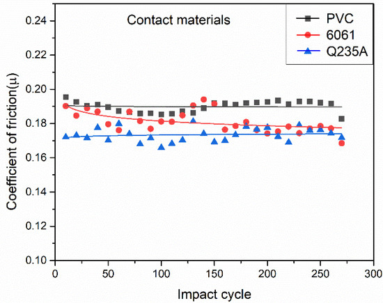 The test results show the effect of a single factor on the coefficient of friction. Figure 5 shows the effect of different materials on the coefficient of friction of the peanut shell surface. All aspects of material parameters influence the coefficient of friction of peanut shells. The coefficient of friction differs for different materials due to different hardness, strength, plasticity, and toughness of the materials. PVC is weaker than the other two materials in resisting material surface pressure. However, the coefficient of friction exhibits a relatively stable change during collision and friction with the peanut. The coefficient of friction of iron and aluminum is small; however, it shows varying degrees of fluctuation due to peanut shell surface tissue damage during collision.