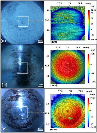 Optical microscopy surface and three-dimensional surface topography images of a pin specimen under different moisture content conditions of the peanut shell: (a) 15%, (b) 25%, and (c) 35%.