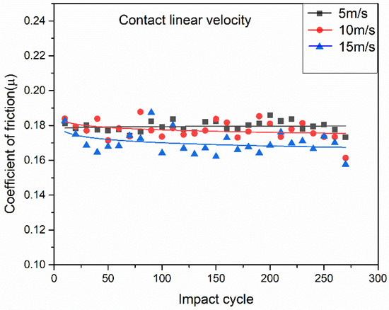 The plot of the influence of different contact linear velocities on the coefficient of friction of the peanut shell’s surface is shown in Figure 7. The contact linear velocity affects the coefficient of friction, presenting an inverse relationship between the peanut and pin during the contact process. The friction coefficient of peanut is between 0.16 and 0.19 when the contact linear velocity is in the range 5–15 m/s. The coefficient of friction shows a difference before 60 cycles of impact contact, which is almost similar when the contact linear velocity is 5 and 10 m/s. However, the coefficient of friction at a contact speed of 10 m/s decreases gradually after 60 cycles because the surface morphology of the pin and peanut shell in the early stage of collision contact changes slightly. The tissue of the peanut contact surface starts to sustain damage, whereas the wear of the pin contact surface and other factors affect the change in the coefficient of friction after a critical point of approximately 60 cycles. Similarly, the coefficient of friction of the friction pair shows a decreasing trend after 10 cycles and tends to stabilize after 40 cycles when the contact speed condition is 15 m/s. Compared with the contact linear velocity conditions of 5 and 10 m/s, fluctuations appear earlier in the coefficient of friction when the contact linear velocity is 15 m/s. This indicates that an increase in the contact linear velocity in the contact friction between the peanut shell and pin accelerates the appearance of contact surface damage so that the friction pair can reach a stable contact state as soon as possible. These factors also affect the coefficient of friction.