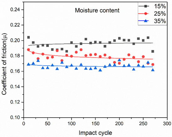 The effect of the peanut’s moisture content on the coefficient of friction is shown in Figure 9. The results show that the friction coefficient of peanut is between 0.15 and 0.21 when the moisture content of peanut is in the range 15–35%. The coefficient of friction decreases with increasing the peanut’s moisture content because the moisture in the peanut shell is transferred to the contact surface during the contact process, which acts as a lubricant to participate in the contact friction behavior. It is also the main factor affecting the change in the coefficient of friction. The coefficient of friction shows a declining trend within 20 cycles and is highly stable when the peanut’s moisture content is 35%.