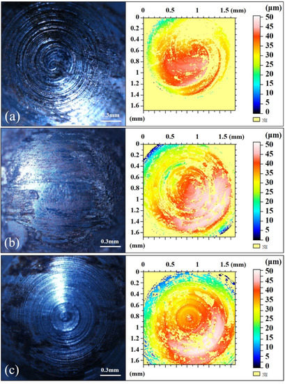 Figure 10 shows the surface morphology of the pin after the peanut impact-friction test under different peanut moisture content conditions. The topography of the contact surface can be clearly observed from the scan image using WSLI, and the color gradient indicates the distribution of the contact surface height from 0 to 50 μm. Figure 10a–c are the surface morphology images (OM and SWLI) under the moisture content conditions of 15%, 25% and 35%, respectively. The surface wear degree of the pin and peanut collision contact is not obvious; however, some peanut tissues are still attached to the pin’s surface even after being worn off. The adhesion degree of the peanut tissue on the pin’s surface is inversely proportional to the peanut’s moisture content. When the moisture content was 15%, the peanut tissue attached to the pin’s surface was concentrated in the central part. However, when the moisture content was 25% and 35%, the peanut tissues attached to the pin’s surface accumulated to one side due to the impact-friction processes. This indicates that the peanut moisture is involved in the impact-friction behaviors during the contact between the pin and peanut, which is also the main factor affecting the change in the coefficient of friction.