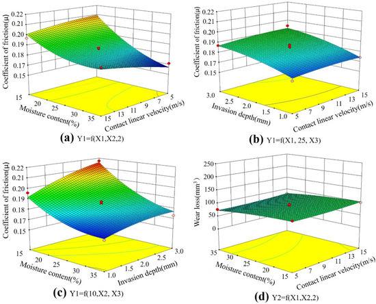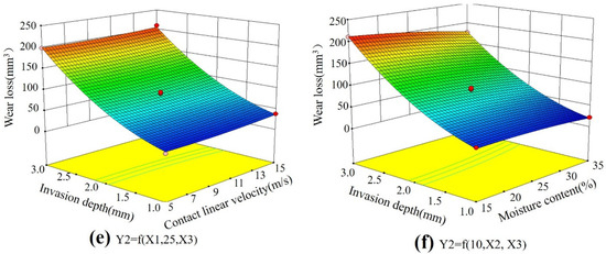 Multiple regression fitting analyses were performed according to the data specimens in Table 2 to find the optimal working parameters. The quadratic polynomial response surface regression model of the coefficient of friction (Y1) and wear loss (Y2) to three independent variables of contact linear velocity (X1), moisture content (X2), and invasion depth (X3) was established. The regression equation was analyzed using analysis of variance (ANOVA), and the results are shown in Table 3. The final equations in terms of actual factors are given by Equations (9) and (10). p < 0.0001 for response surface models of Y1 and Y2 indicates that the regression model is extremely significant. A lack of fit p > 0.05 (0.0531 and 0.1415, respectively) indicates that the regression model has a high fitting degree. The influence of each parameter on regression can be reflected by the value of p. There are two regression terms in the model of Y1 with very significant influence (p < 0.01): X2 and X3. There are also two regression items in the model of Y1 with significant influence (p < 0.05): X1 × X2 and X22. In addition, there are three regression terms in the model of Y2 with very significant influence (p < 0.01): X2, X3, and X32. Further, there are two regression items in the model of Y2 with significant influence (p < 0.05): X1 and X2 × X3. The orders of the influence of the three factors on Y1 and Y2 are X2 > X3 > X1 and X1 > X2 > X3, respectively, which can be confirmed by the F values of each factor (Table 3).