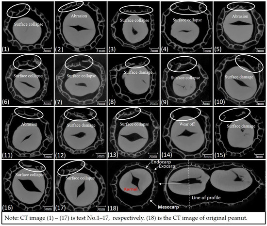 Tomography using micro-CT was used to observe the damage degree of peanut shells after the impact-friction experiment. Figure 12 shows the micro-CT-scan images of the peanut cross-section. Figure 12(1–17) depict the scan images after the orthogonal test Nos. 1–17, respectively. The original diagram of the sash and crosscut scanning of peanuts is shown in Figure 12(18). The crosscut is a section stretching along the maximum diameter of the worn part of the peanut pod’s surface. Peanut pod tissue is divided into exocarp, mesocarp, and endocarp (Figure 12(18)). The morphology of peanut pod tissue was used to judge the wear and damage degree of peanut after the orthogonal test. The damage of peanuts was divided into four grades: abrasion, collapse, cracking, and breaking. Figure 12(1), (3), (7), (8) and (17) show the phenomenon of surface collapse and slight cracking on the surface of peanut shells when the test conditions are all taken as intermediate values (contact linear velocity is 10, moisture content is 25, and invasion depth is 2) and the average wear rate is 89.298 mm3. The coefficient of friction for this condition ranges from 0.182 to 0.187. This range of friction coefficients can be used as a critical point for peanut shell damage in peanut harvesting equipment and simulation analysis. In Figure 12(10), (12), (14) and (15), the peanut pod tissues are severely damaged with pod loss, and their Y2 is within 150–200 mm3. In Figure 12(14), the wearing of the peanut shell tissue occurs when the moisture content is at least 15%. The lower the moisture contents of the peanut pods, the greater the brittleness of their shells. Their ability to resist damage is smaller, and the wear situation is mainly brittle spalling. This is because the peanut shell mainly comprises cellulose and crude fiber. The gap between the peanut kernel and shell increases with decreasing the peanut’s moisture content. The surface deformation of the peanut shell decreases with increasing brittleness.