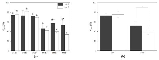 Cut-level NM% exceeded 70% under MPs in the two cuts, but there was no significant difference between cut 1 and cut 2 (Figure 1b). Under MBs, cut-level NM% was lower than 60% and was significantly higher (p < 0.05) in cut 1 than in cut 2.