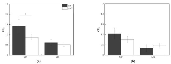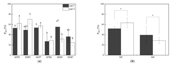 Cut-level PM% in cut 1 under MPs was significantly lower (p < 0.05) than that in cut 2, although both exceeded 50% (Figure 2b). By contrast, cut-level PM% in cut 1 under MBs tended to be higher than that in cut 2. Cut-level PM% in both cuts under MBs was below 40%.