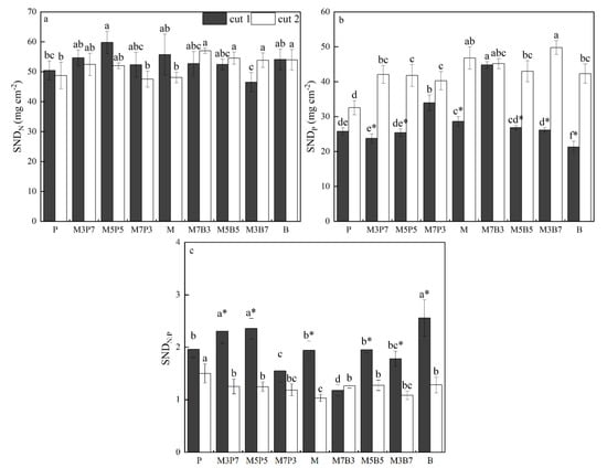 Interactions between cut and species combination and between sowing ratio and combination significantly affected SNDN (p < 0.05; Table 7). There were no significant differences in SNDN between cut 1 and cut 2 (Figure 4a). There were also no significant differences in SNDN among grasslands of the same cut, except between M5P5 and timothy monoculture and M3B7 in cut 1. In cut 2, timothy monoculture, M7P3 and lucerne monoculture had significantly lower SNDN than smooth bromegrass monoculture and all the smooth bromegrass mixtures.