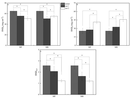 Cut-level SNDN was significantly higher (p < 0.05) at the initial stage (beginning of green returning) than that at the flowering stages in both cuts (Figure 5a). Cut-level SNDN was significantly higher (p < 0.05) at the flowering stage in cut 1 than that in cut 2 under MPs, whereas the opposite result was observed under MBs. Cut-level SNDP increased significantly (p < 0.05) from the initial stage to the flowering stage in cut 2 (Figure 5b). Cut-level SNDN:P at the initial stage was significantly higher (p < 0.05) than that at the flowering stages in cuts 1 and 2, and it was significantly lower (p < 0.05) in cut 2 than in cut 1 (Figure 5c).