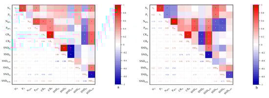 Correlations between nutrient competitiveness, nutrient uptake, and soil nutrition status at (a) cut 1 and (b) cut 2 NM% and PM%: proportion of lucerne N and P uptake, respectively; NT and PT: total N and P uptake, respectively, in the mixtures; SNDN: soil N density; SNDP: soil P density; SNDN:P: soil N:P density ratio; i: at the initial stage; e: at the flowering stage. Asterisks (*) show a significant correlation at p < 0.05.