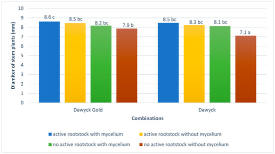 The best trunk diameter was that of the tested beech cultivars where the rootstocks were active and treated with mycelium, and only one of the treatments was applied; however, it did not differ significantly (Figure 2). The smallest diameter was found in beech plants without these treatments.