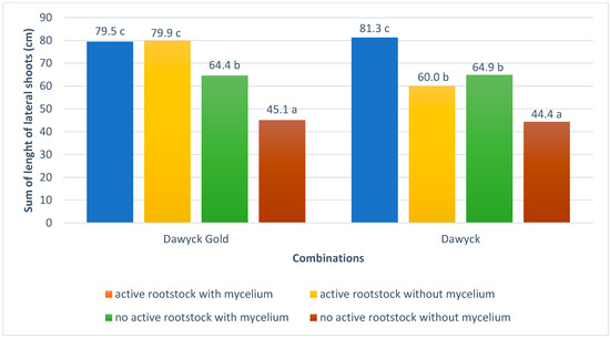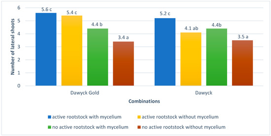 The length of lateral shoots and their number for Dawyck cultivars were highest when two treatments were performed simultaneously before grafting. For Dawyck Gold cultivars, the length of lateral shoots and their number were also highest when the rootstock was activated and T. atroviride was not applied. On the other hand, the absence of these treatments resulted in the lowest values of the parameters in question (Figure 3 and Figure 4).